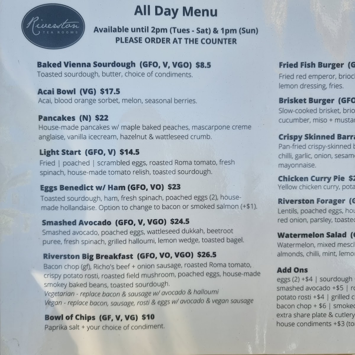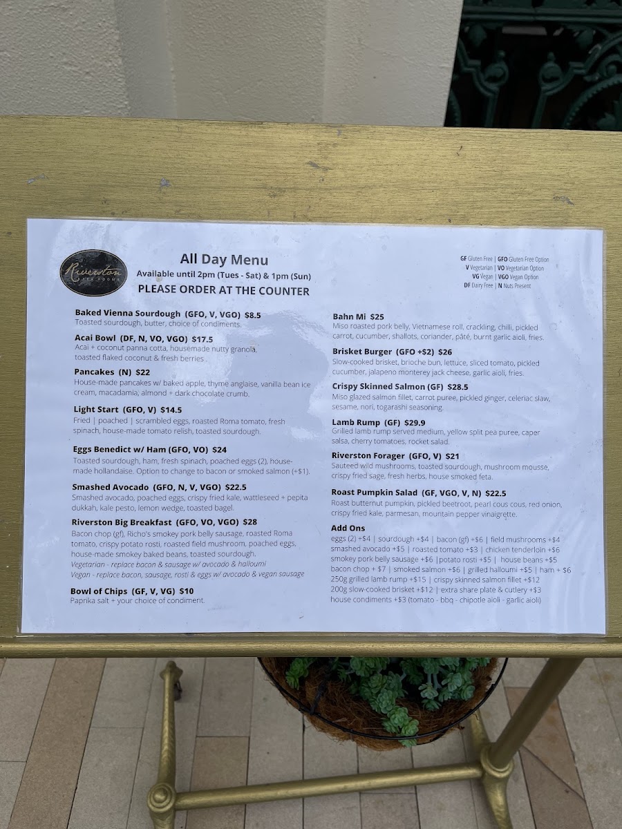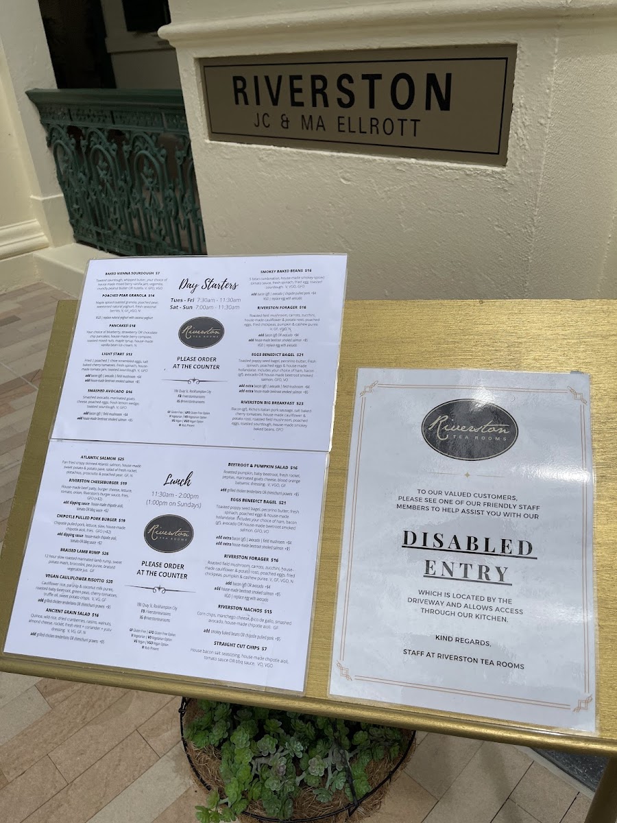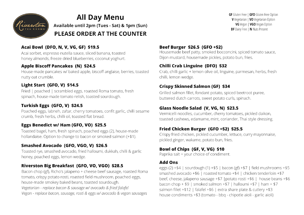The menu at Riverston Tea Rooms offers a variety of dishes that cater to different tastes. For breakfast or brunch, you can enjoy the Baked Vienna Sourdough, Nutty Granola, or the Light Start Hashbrown Benedict w/Ham. For those seeking something more indulgent, the Chorizo Eggs provide a flavorful option. If you're in the mood for a refreshing drink, their wine list features selections like Squealing Pig Prosecco and Juliet Moscato, while 821 South Sauvignon Blanc and Seppelt The Great Entertainer Chardonnay provide more wine variety. For beer and cider lovers, options include Stone & Wood Pacific Ale, Corona, and Great Northern Super Crisp. The Great Northern Original and Peroni Leggera are also available, ensuring there's something for every palate. The kid's menu is perfect for younger diners, with options like Kids Pancakes, Kids Bacon & Eggs, Kids Breakfast Burger, Chicken Bites, and Battered Fish Bites. This diverse menu combines hearty meals, light bites, and a good selection of drinks, making Riverston Tea Rooms a great spot for any time of the day.