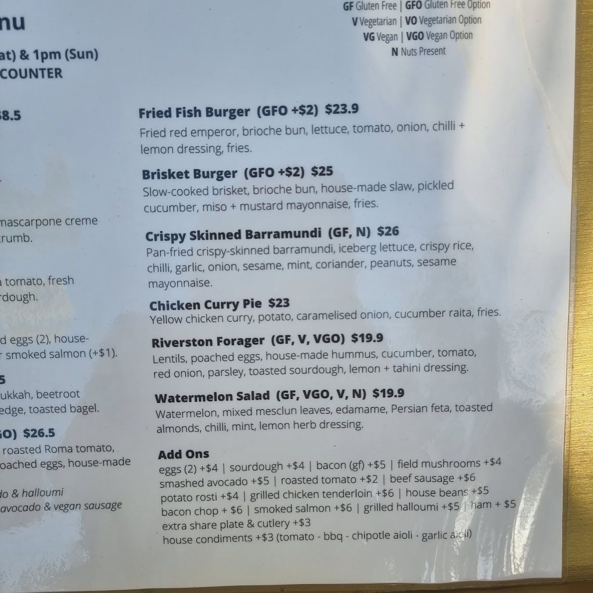 eggs (2) +$5 | sourdough +$5 | bacon (gf) +$7 | field mushroom +$6 | smashed avocado +$7 | roasted tomato +$4 | smoked pork belly sausage +$7 | potato rosti +$7 | grilled chicken tenderloin +$8 | house condiments +$3 (tomato - bbq - chipotle aioli - garlic aioli) | smoked salmon +$9 | grilled halloumi +$7 | bacon chop +$9 | ham +$7 | crispy skinned salmon fillet +$14 | extra share plate +$3